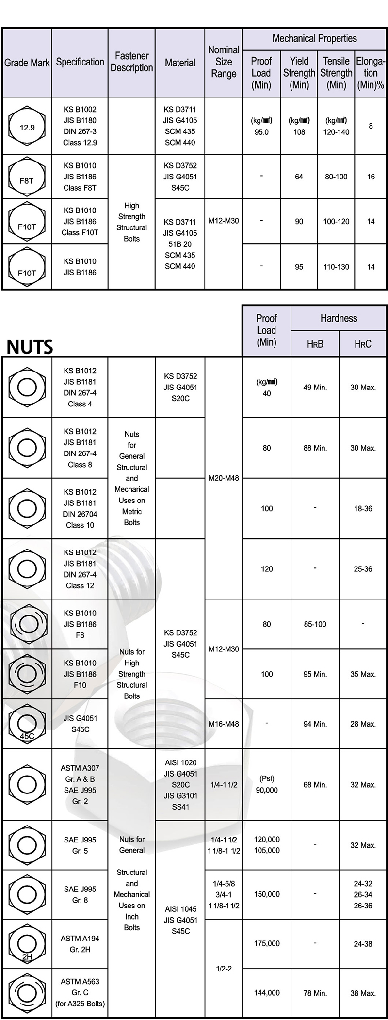 Etc. | grade markings and mechanical properties for steel fasteners
